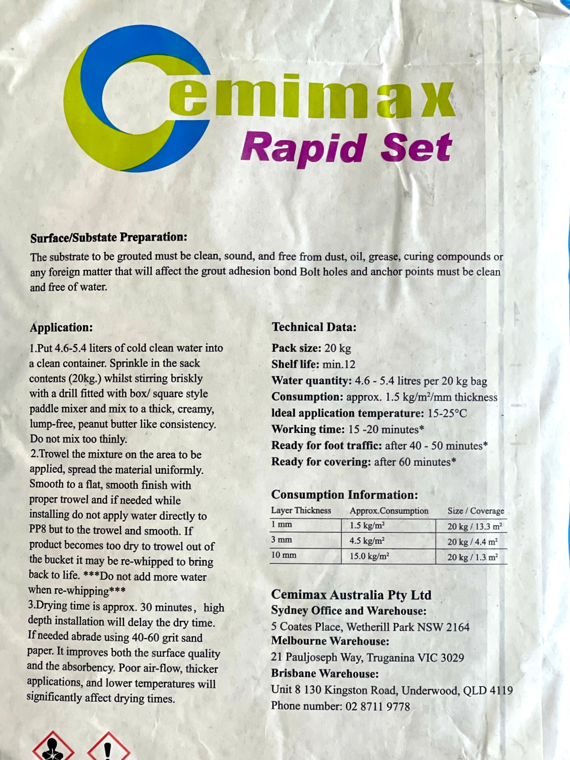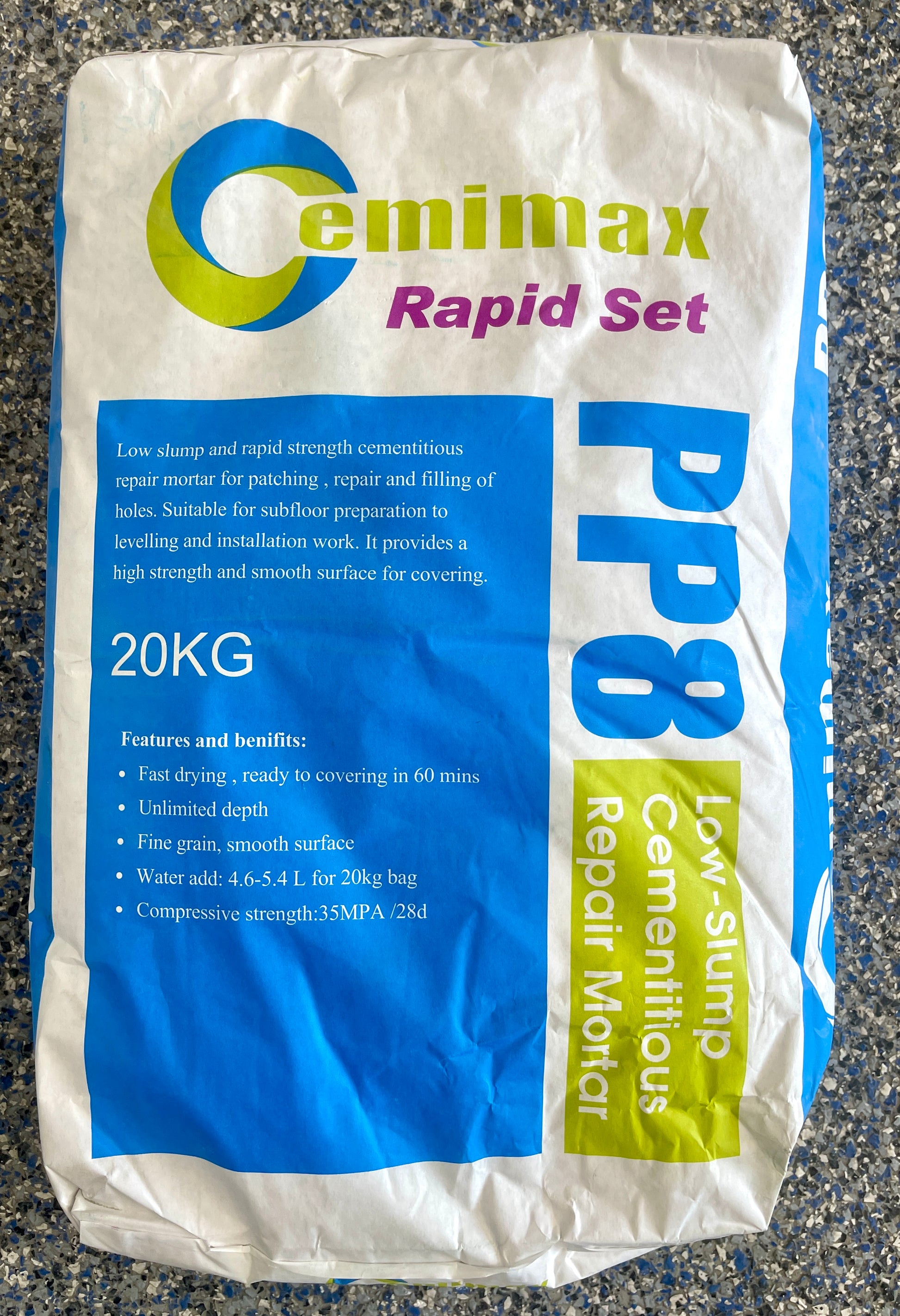 Low slump and rapid strength cementitious repair mortar for patching, repair and filling holes. Suitable for subfloor preparation to leveling and installation work. It provides a high strength and smooth surface for covering.